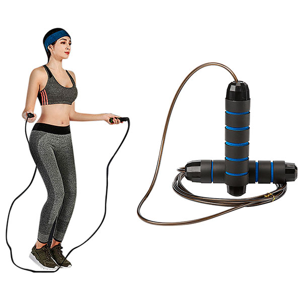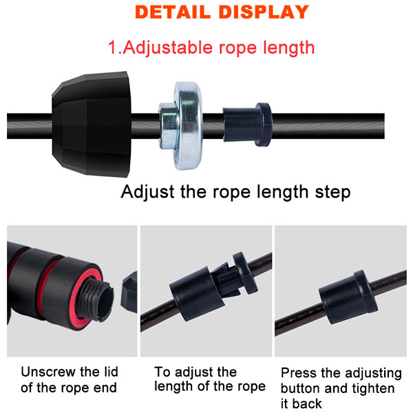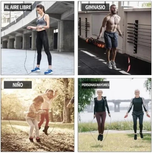 - Sistema de rodamiento de bolas, con alambre de acero recubierto de PVC. Esto le permite de verdad ser una cuerda libre de enredos, la rotación es suave y fluida. Y a la vez también es durable.